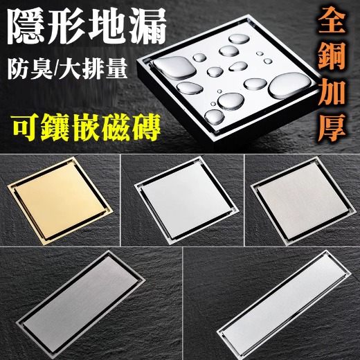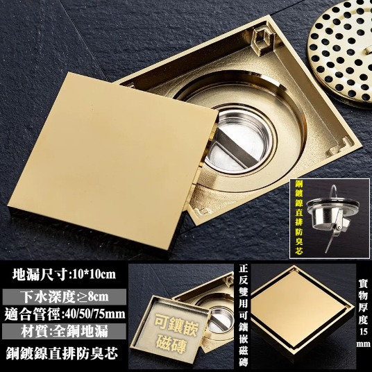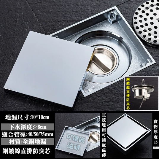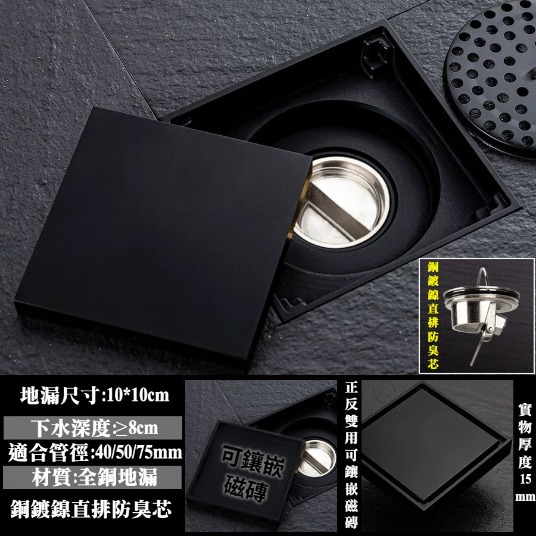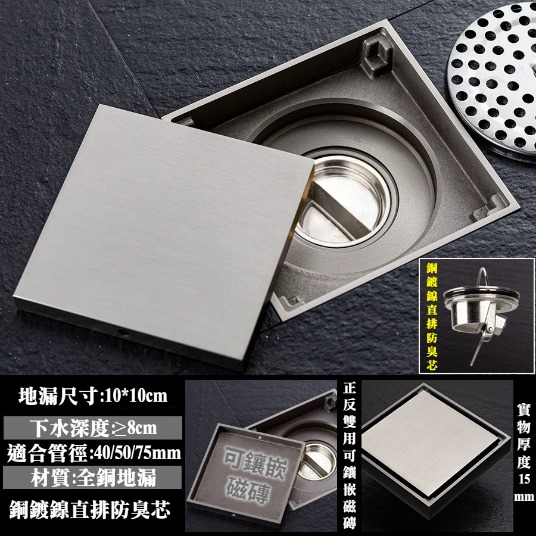 隱形地漏 全銅加厚 銅鍍鎳直排防臭芯 正反面雙用、可鑲嵌磁磚 大排量、下水深度≥8cm 適用管徑:40/50/75mm 尺寸:長10cm|寬10cm|厚度15mm 亮光-金 啞光-黑 亮光-銀/鍍鉻 啞光-鎳拉絲